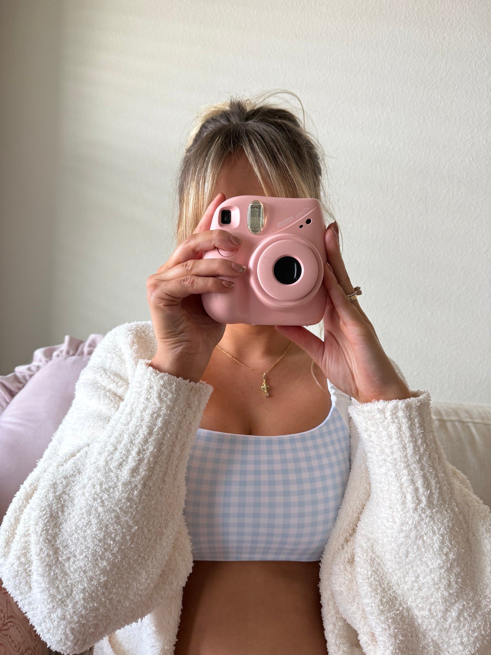 The Gingham Print Scrunched Strap Sports Bra features a timeless gingham print paired with softly scrunched straps for added texture and style. This Bra comes with removable patting.